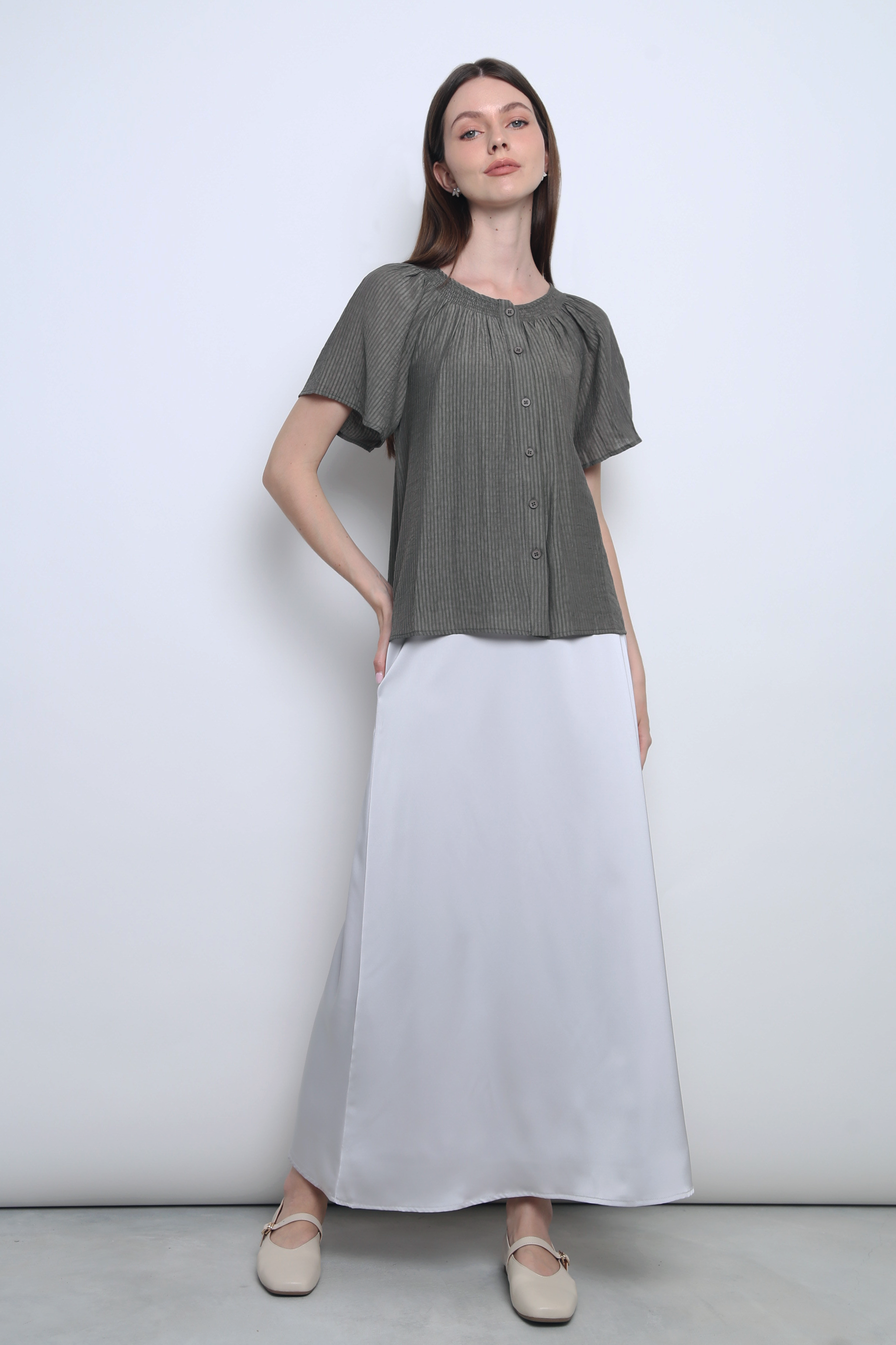 A soft feminine staple designed for everyday ease. It features a relaxed silhouette with gentle gathers along the neckline, flutter sleeves, and a full button-down front. Crafted from a lightweight, it offers breathable comfort and effortless charm. Wear it tucked into tailored trousers for work or pair it with flowy skirts for a weekend-ready look.