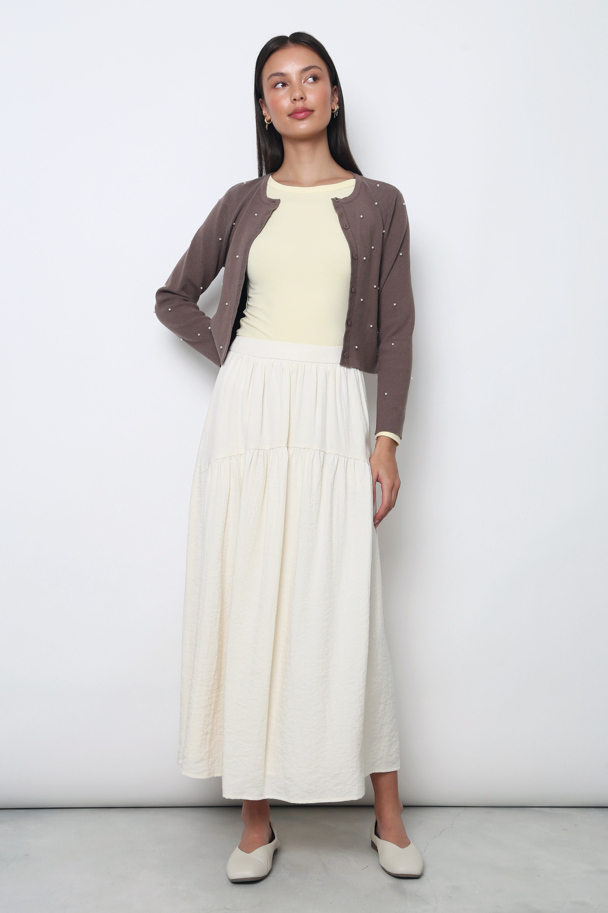 A versatile knit outerwear piece constructed from a soft, fine gauge fabric. It features a classic round neckline and a clean button-front closure, presenting a refined look. The silhouette is generally fitted across the shoulders and torso, finishing with a tidy hemline that sits near the natural waist, making it ideal for layering or wearing alone.