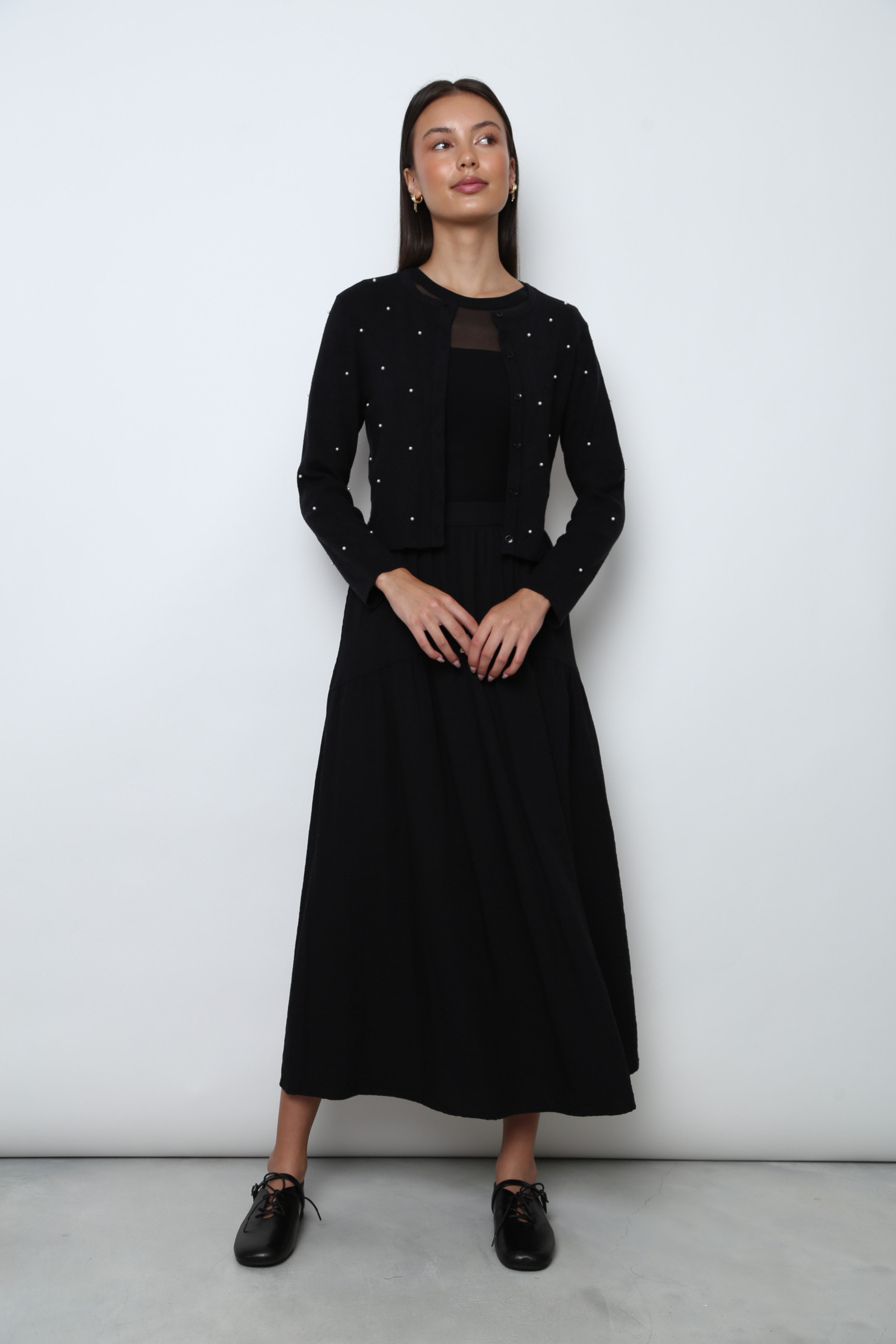 A versatile knit outerwear piece constructed from a soft, fine gauge fabric. It features a classic round neckline and a clean button-front closure, presenting a refined look. The silhouette is generally fitted across the shoulders and torso, finishing with a tidy hemline that sits near the natural waist, making it ideal for layering or wearing alone.
