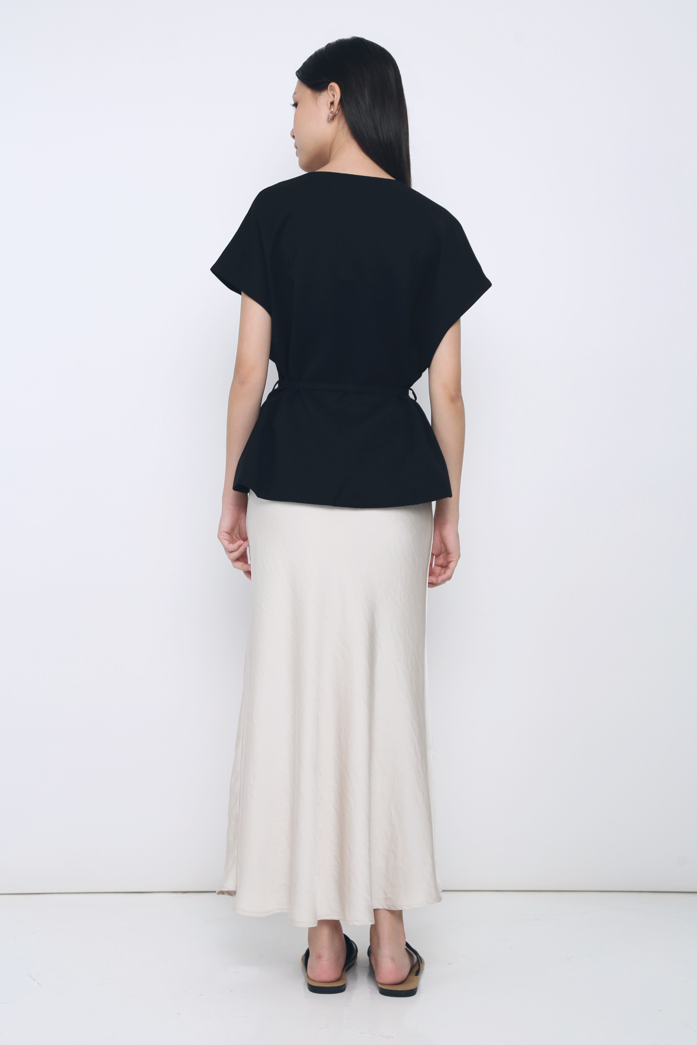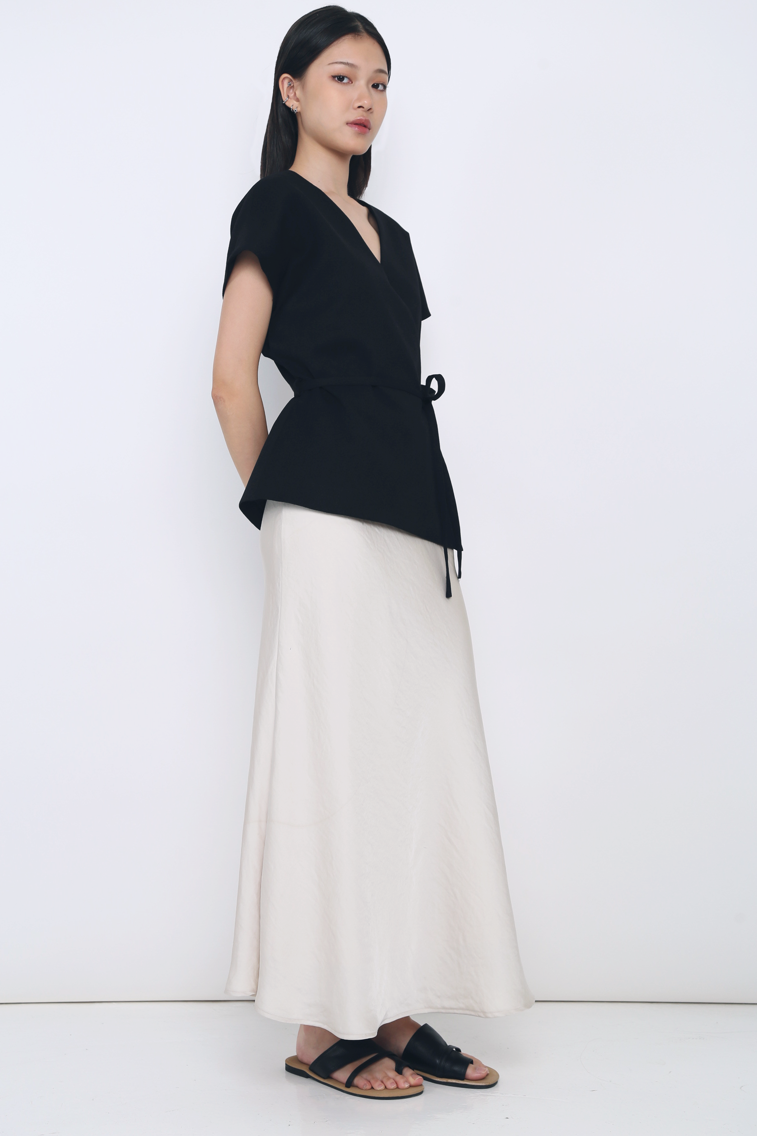The Dawn Kimono Wrap Blouse offers a stylish, adjustable fit in a premium polyester-cotton blend. Fully lined, it features a V-neck wrap design and a detachable sash for a defined silhouette. Available in classic black and soft cream, it's a versatile piece for any occasion.