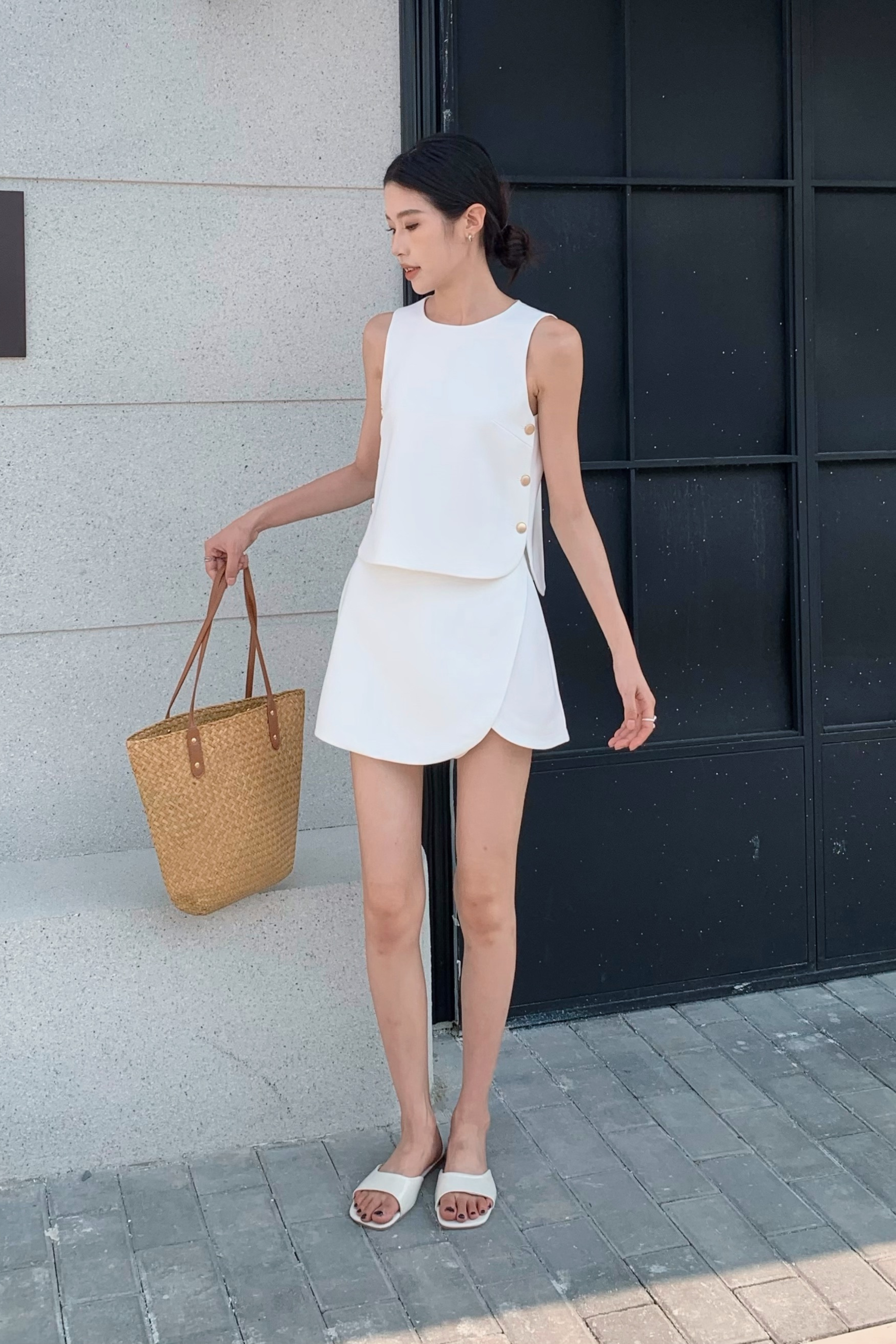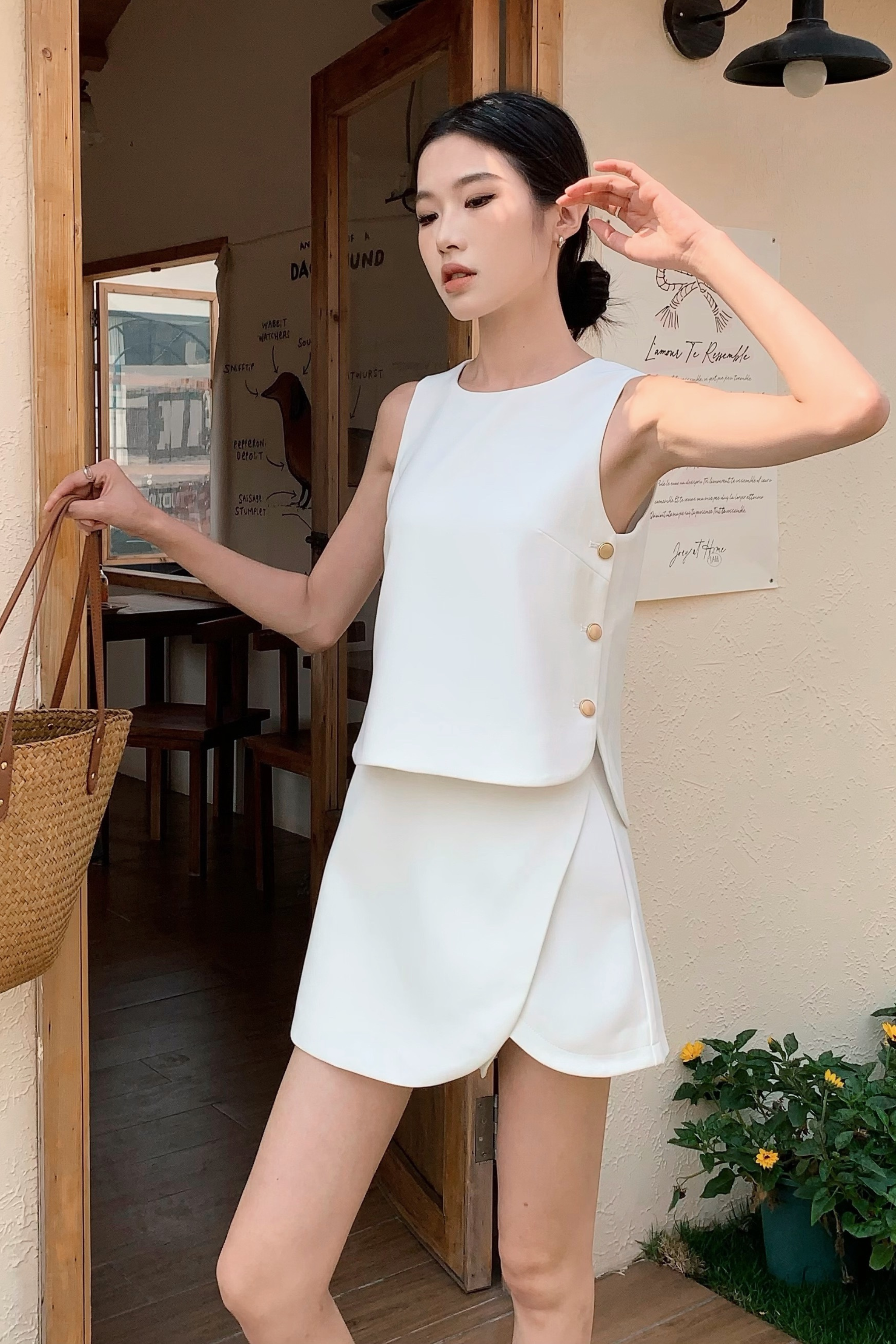 Sleek, structured, and seriously stylish, this sleeveless blouse is a wardrobe win! Comes with matte gold buttons for a polished feel. Perfectly versatile, it brings easy elegance to any look!