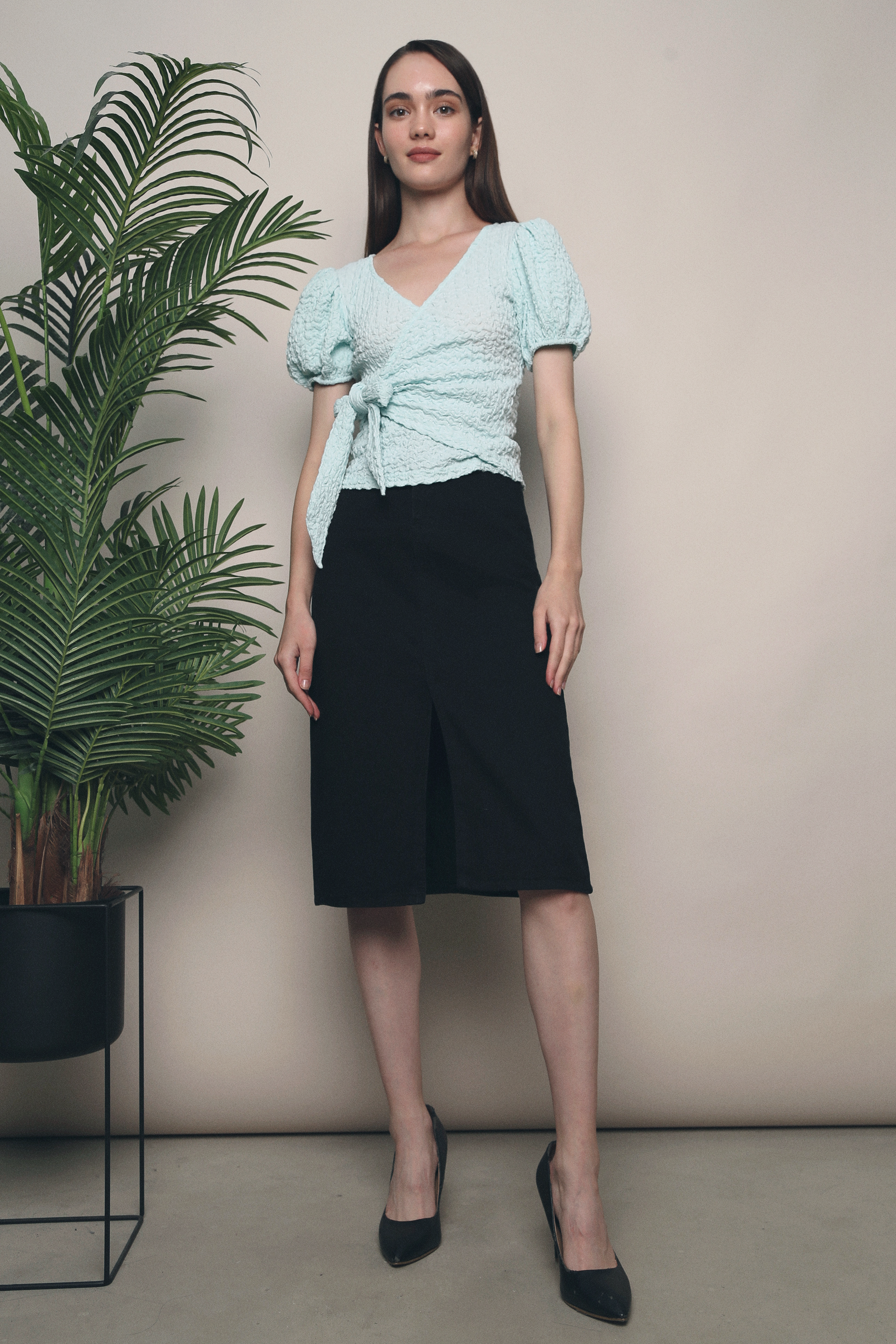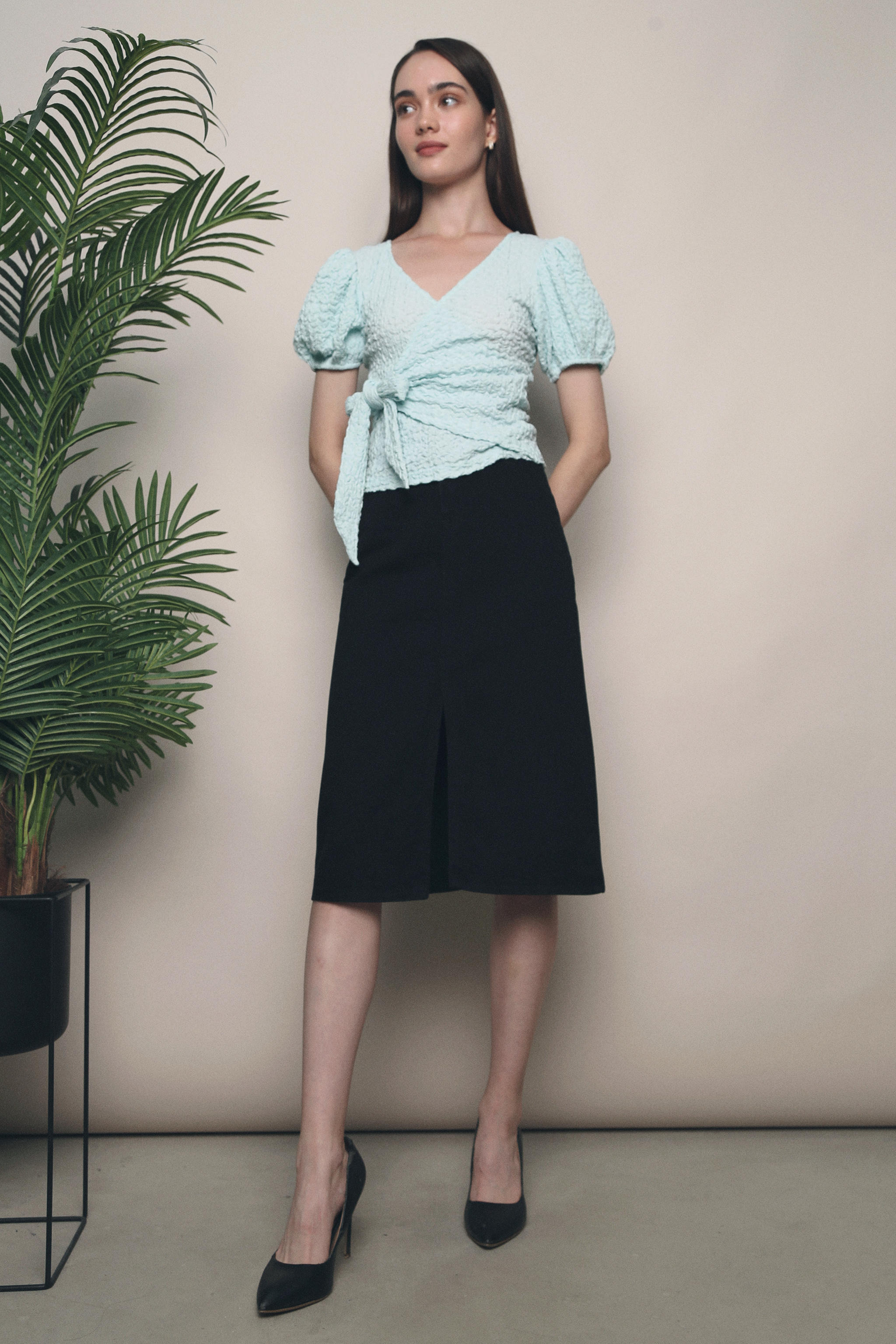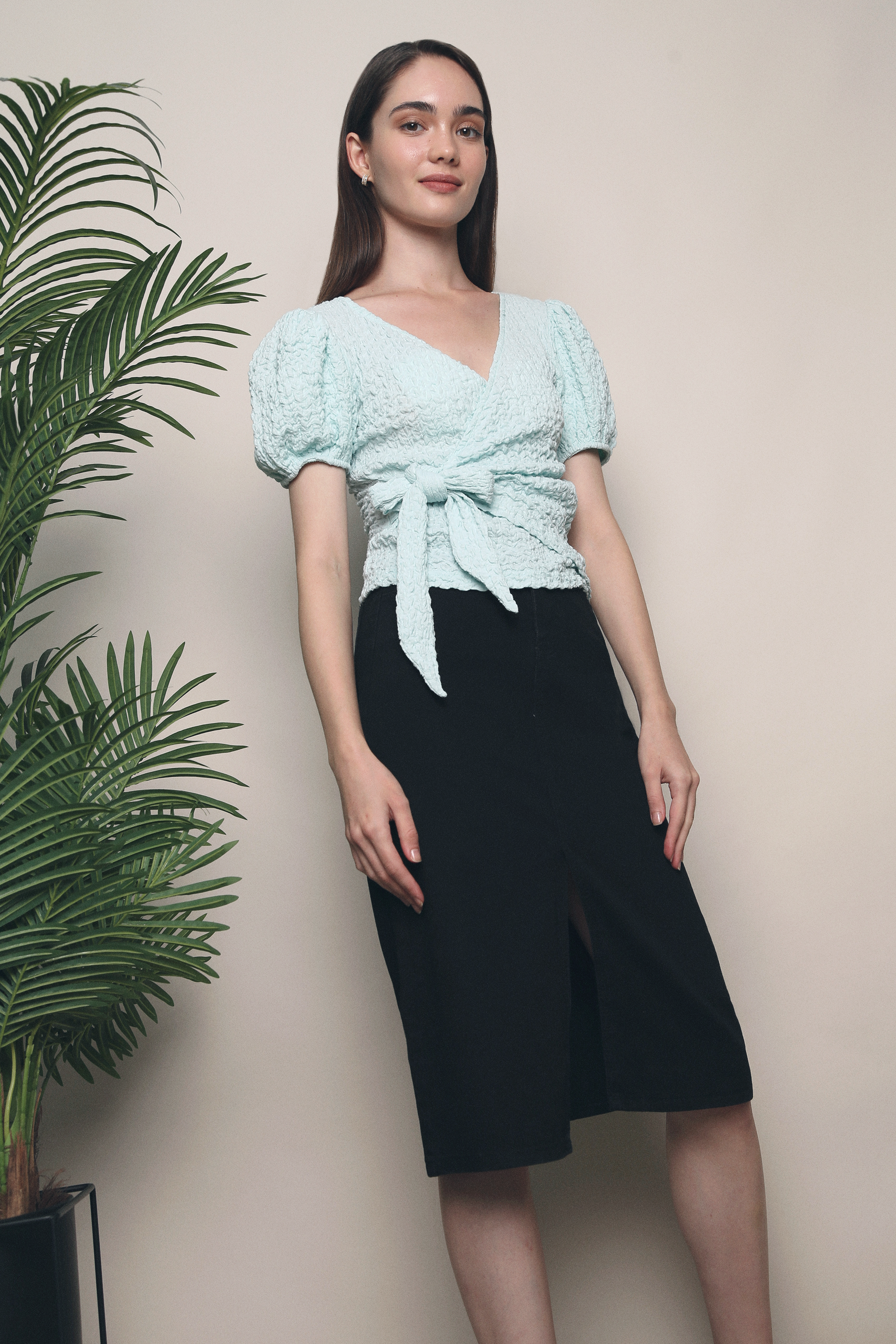 Spice up your basics with Phoebe Textured Wrap Blouse. Flatters any body type with it’s form-fitting figure.Made of stertchable polyester blend Functional tie at waist