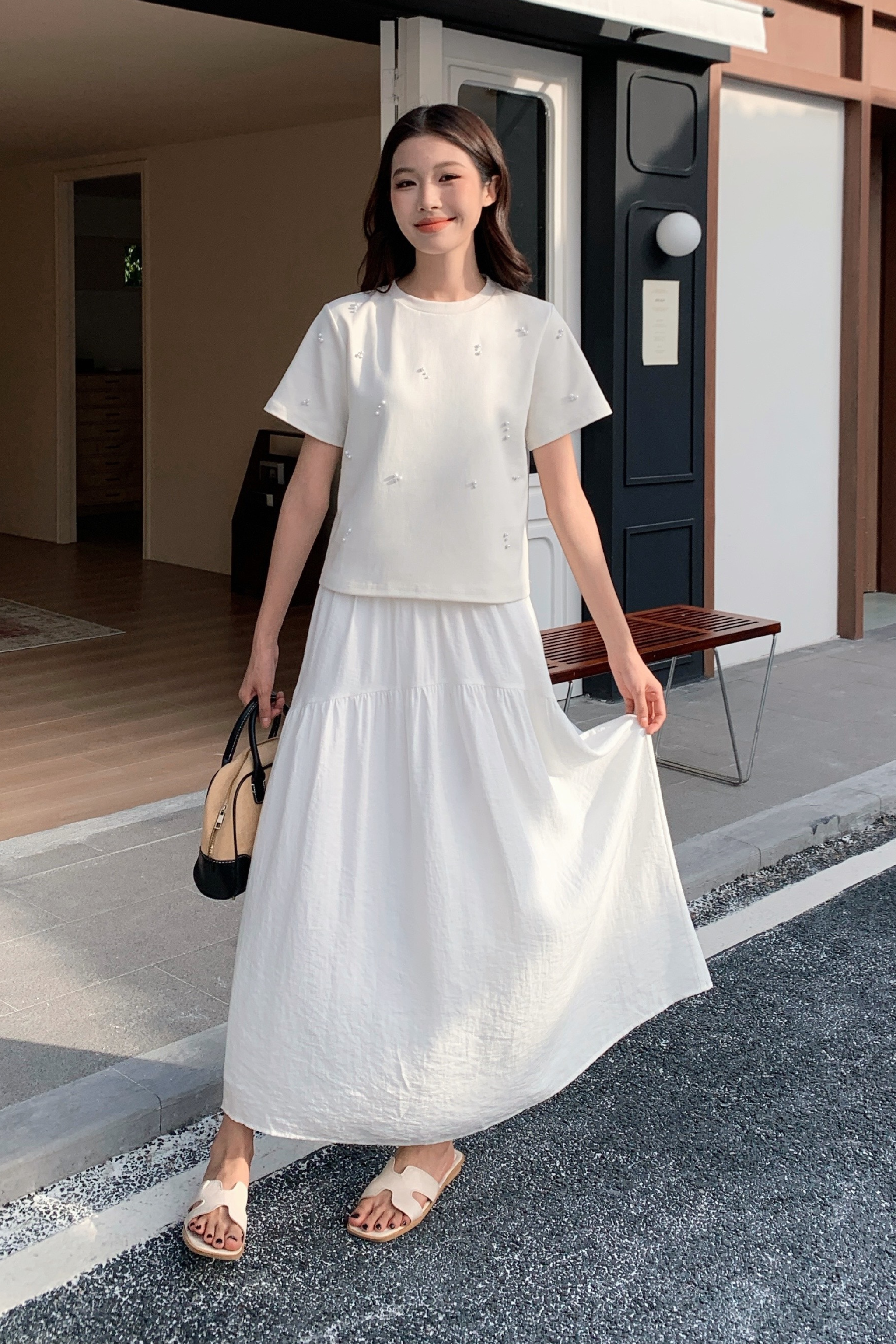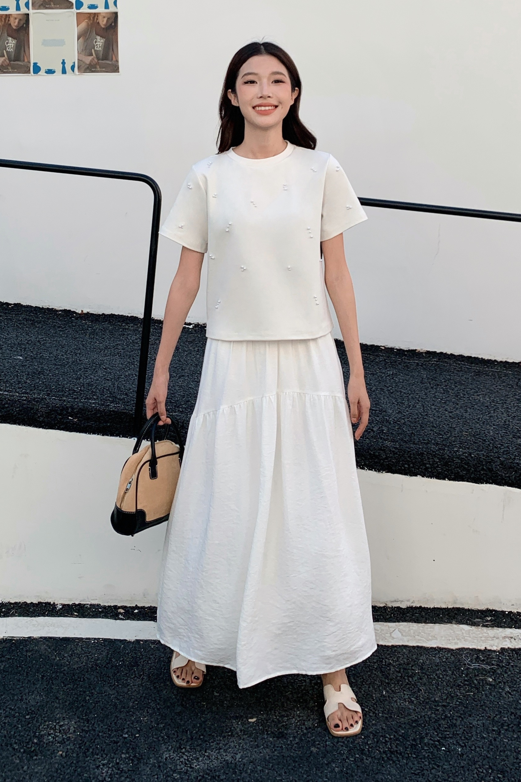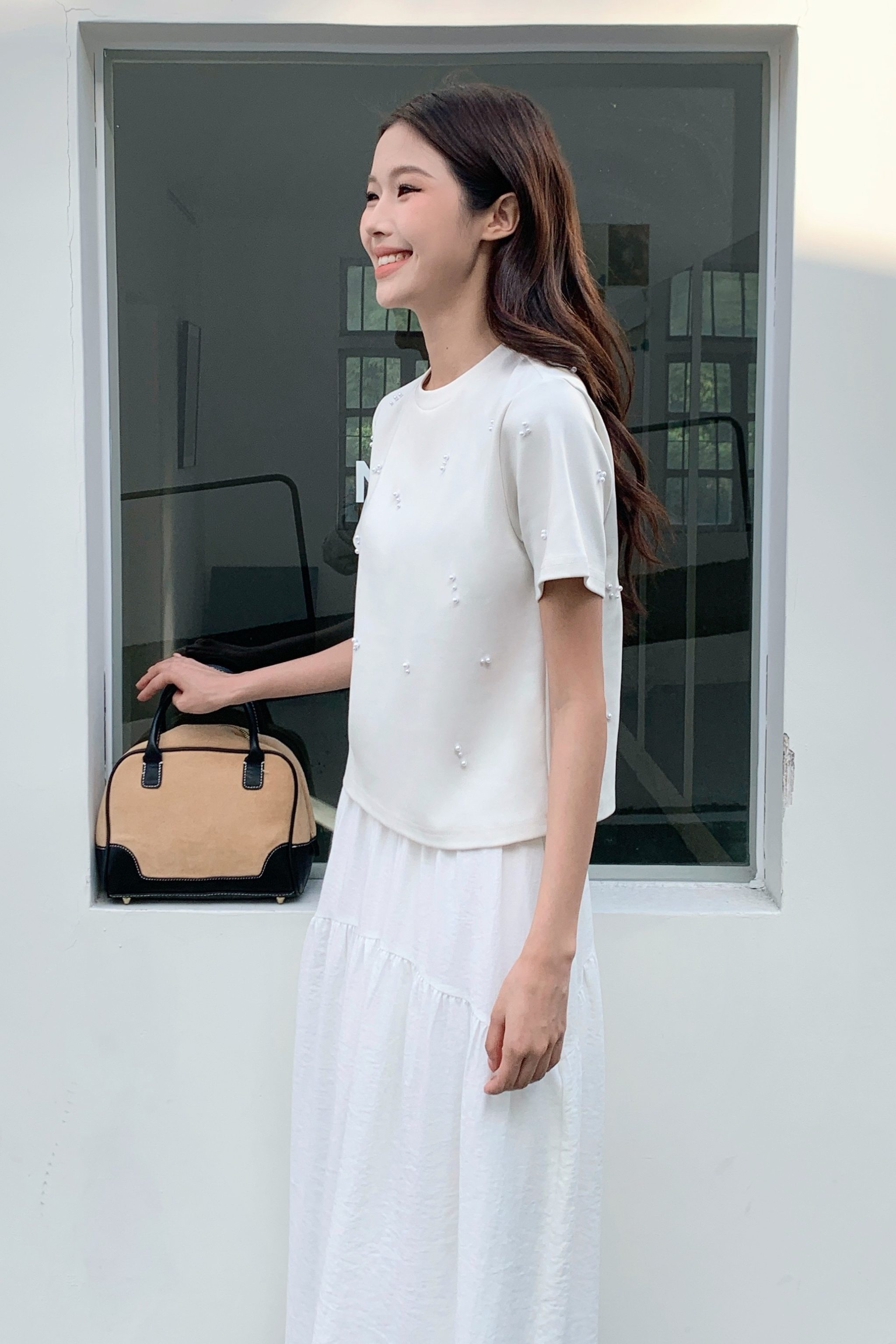 A charming twist on a classic tee, this piece adds a touch of elegance to your everyday wardrobe. Its delicate pearl embellishments lend subtle sophistication, making it perfect for both casual outings and dressier occasions.