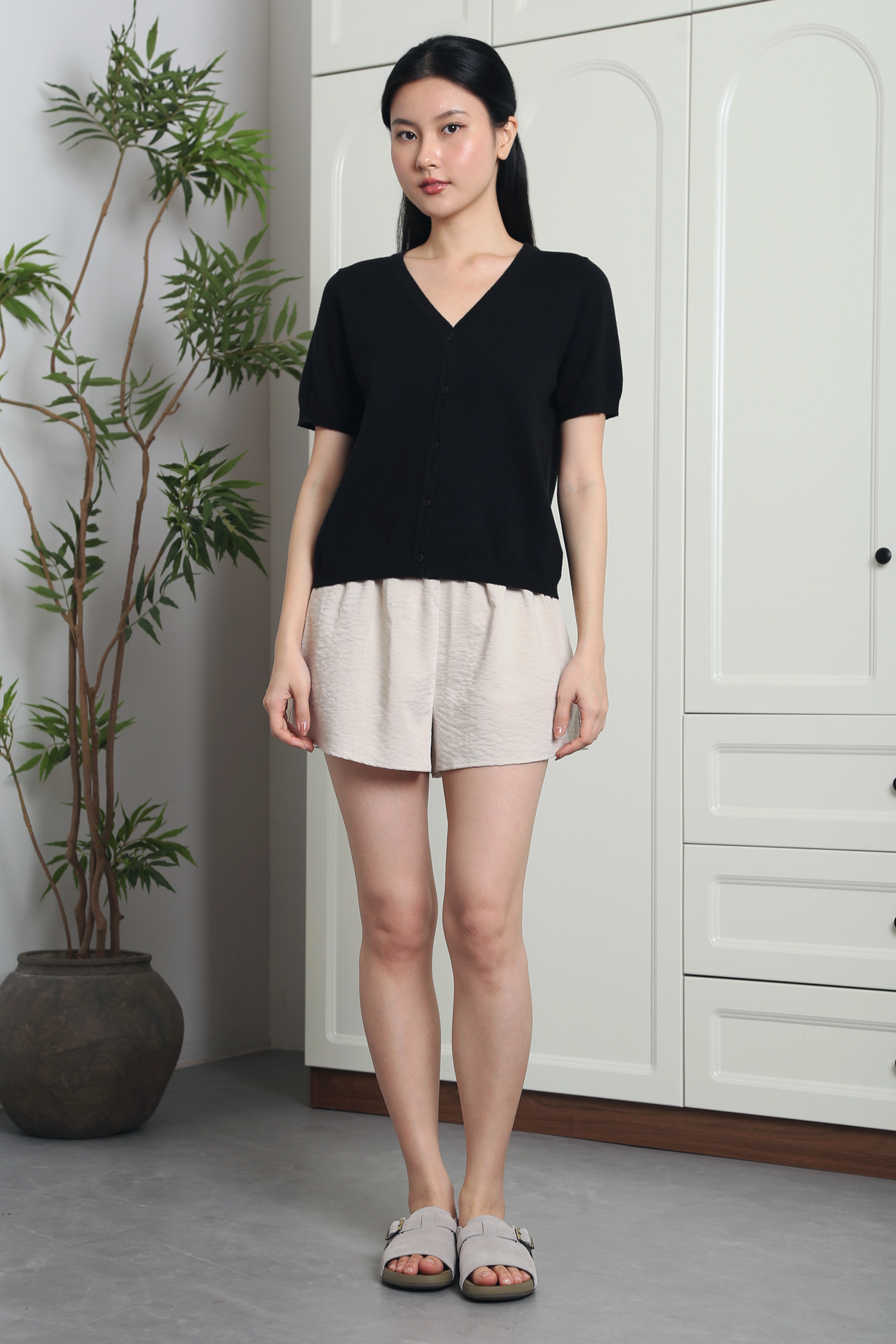 Easy, comfortable, and endlessly versatile. These black shorts feature a stretchy elastic waistband for a flattering and flexible fit, with soft pleating that adds subtle volume and movement. Designed in a lightweight fabric, they’re perfect for everyday wear—whether styled casually with a tee or dressed up with a blouse.