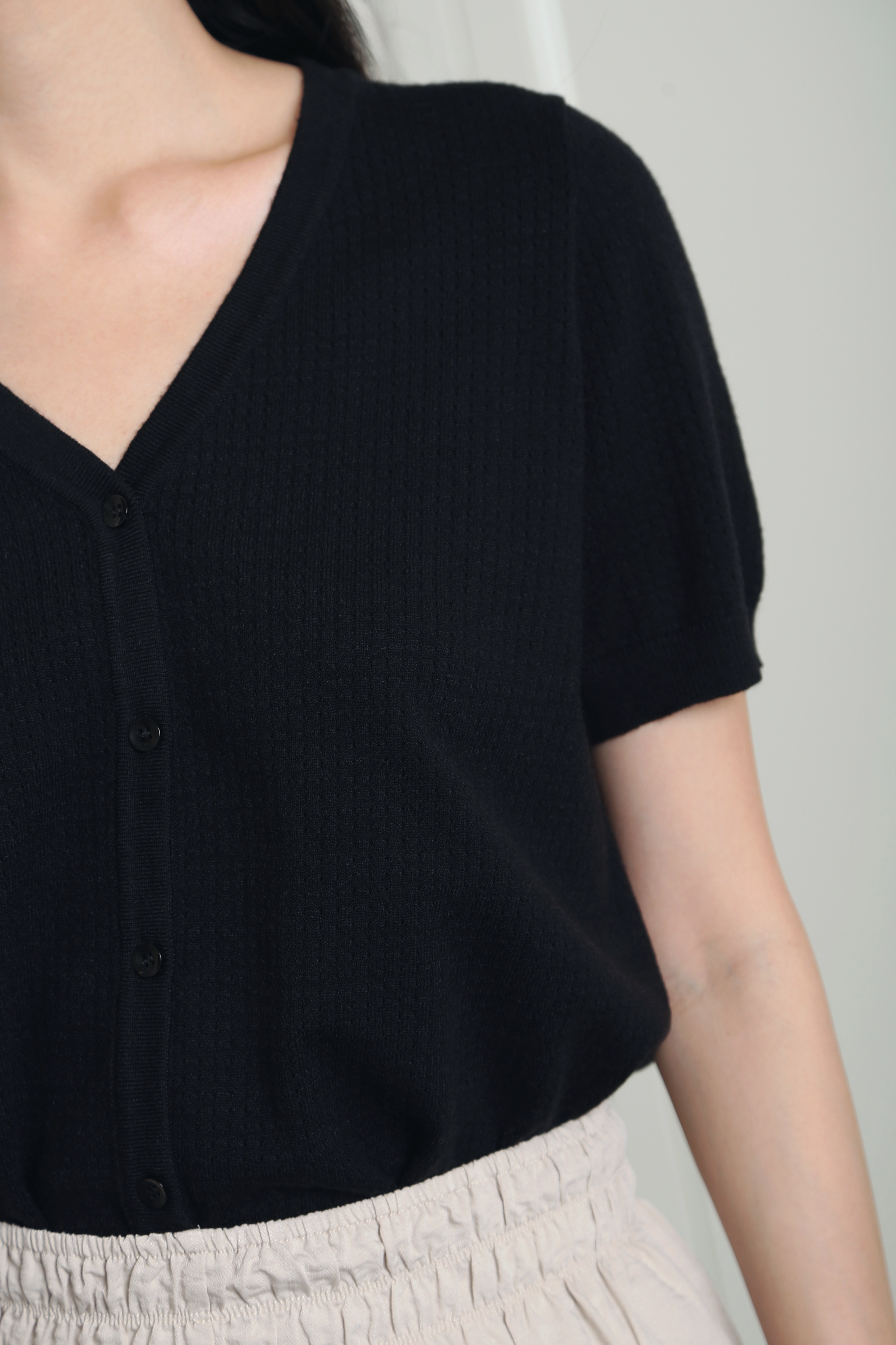 A versatile knit blouse featuring a flattering V-neckline and subtle waffle texture with delicate eyelet details for added dimension. Designed with functional front buttons and short sleeves, it offers a comfortable yet polished everyday look. Easy to style for workdays, casual outings or weekend brunches — pair it with tailored trousers or skirts for a refined outfit, or wear it with denim for a relaxed, effortless ensemble.